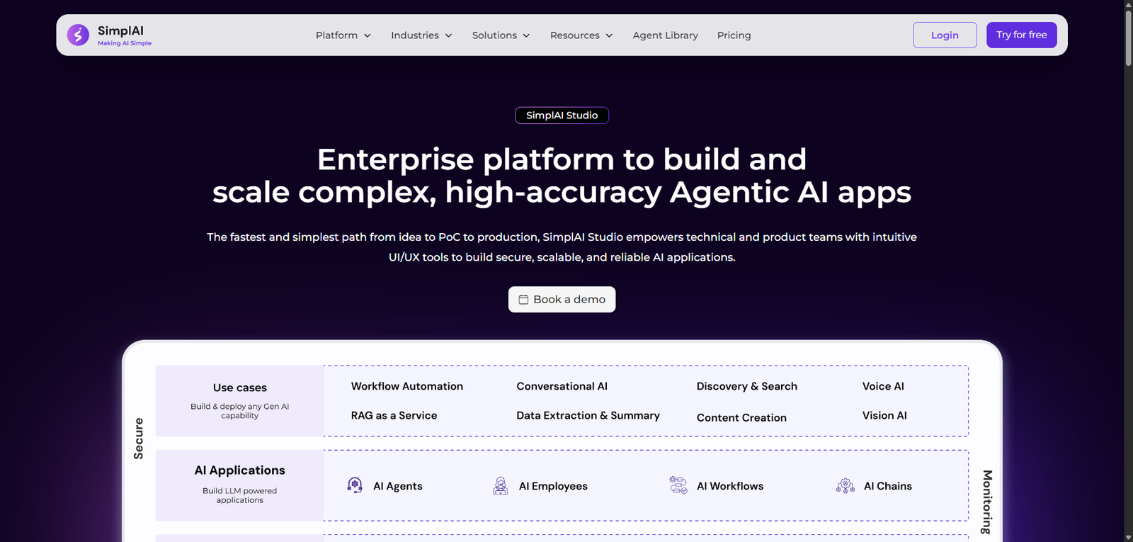 SimplAI is an enterprise AI platform for building and deploying scalable AI agents with strong security, automation, and analytics capabilities. It enables organizations to streamline workflows and adopt AI across business operations.