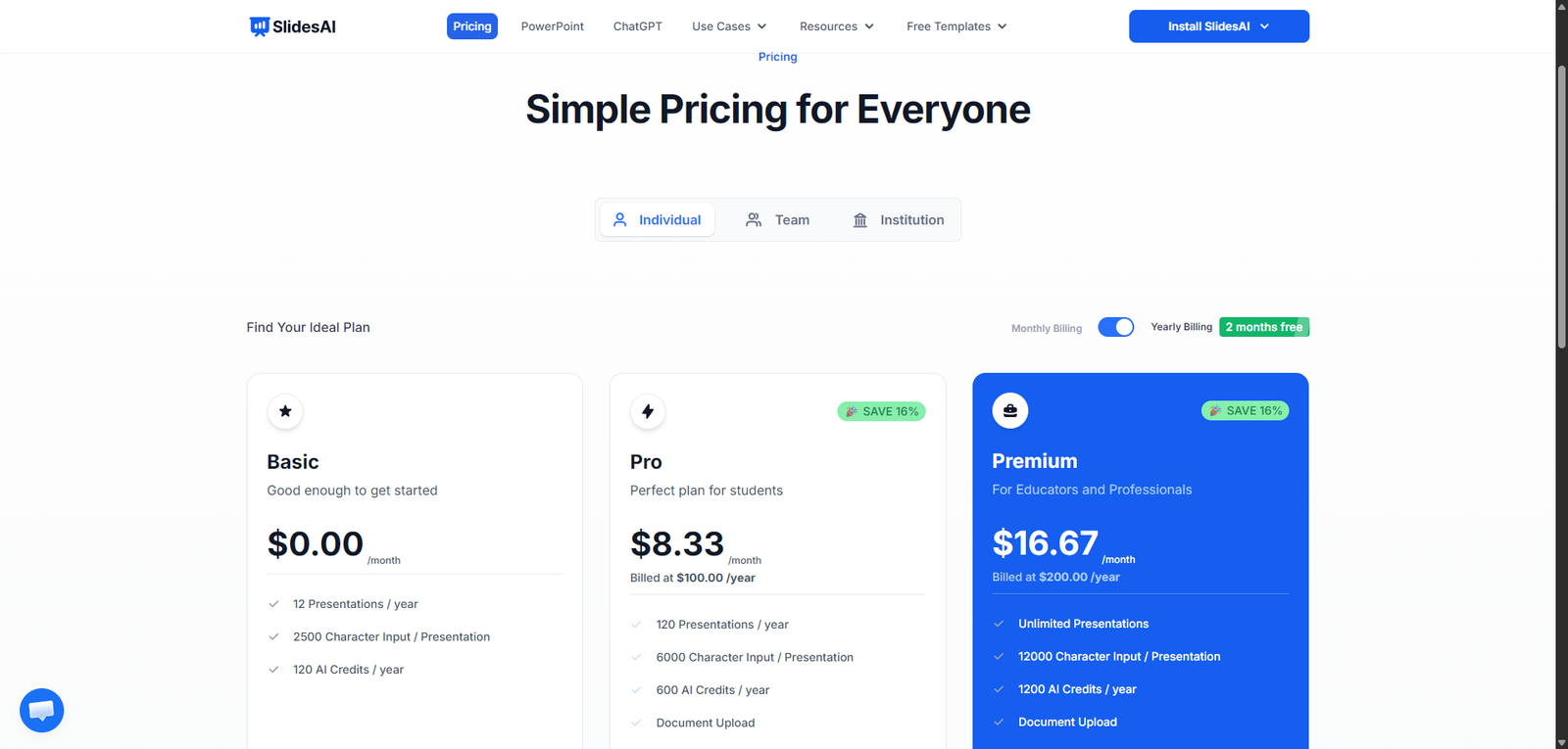 SlidesAI is a simple and effective AI presentation generator that helps users turn text into slides quickly. It is best suited for speed and convenience, especially within the Google Slides ecosystem, though advanced design needs may require additional tools.